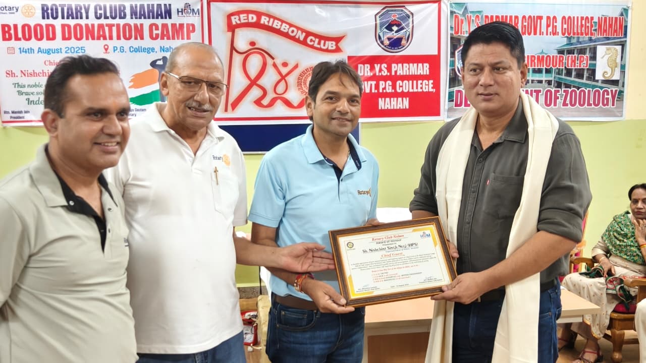 रोटरी क्लब नाहन एवं विभागीय प्राणीशास्त्र ने डॉ. वाई.एस. परमार पीजी कॉलेज नाहन के रेड रिबन क्लब के सहयोग से एक भव्य रक्तदान शिविर का आयोजन किया। इस शिविर में कुल 51 यूनिट रक्त एकत्रित किया गया।